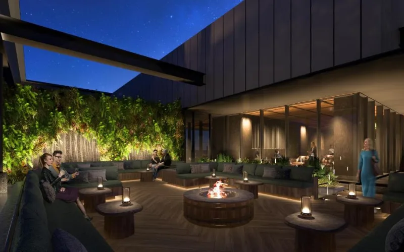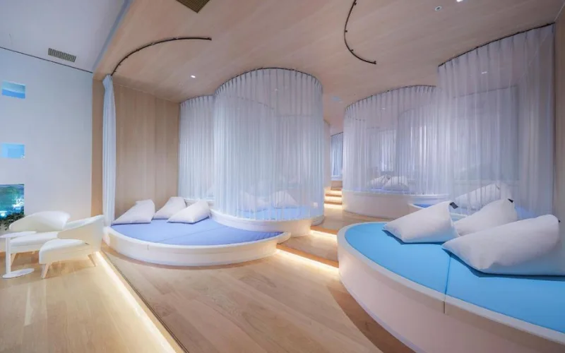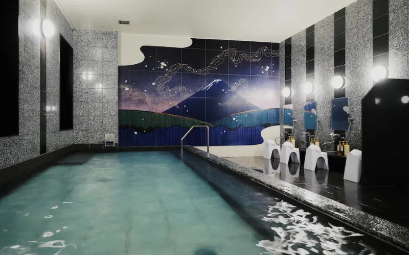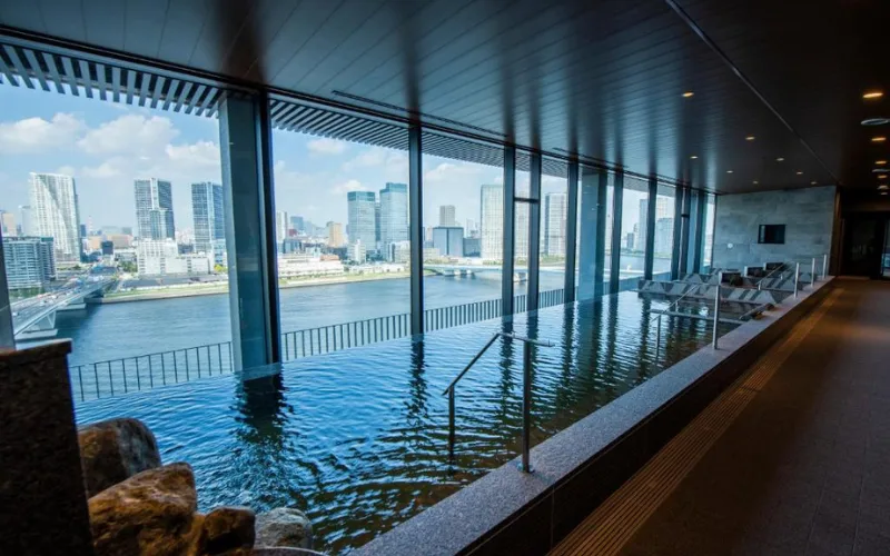 Directly connected to Lalaport Mall & Supermarket. Rooftop onsen with stunning views.
