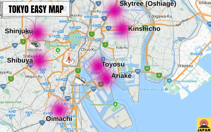 Use this map to see how Toyosu, Oimachi, Kinshicho, Oshiage, and Ariake offer a convenient alternative to crowded centers like Shibuya, while maintaining easy access to major sights. Let’s take a closer look at what each area has to offer and the best hotels to choose.